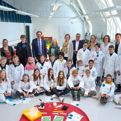 Beim heutigen Besuch des Lehr-Lern-Labors an der Montanuniversität Leoben. Rektorin Andrea Seel (PPH Augustinum, 3.v.l.), Rektor Wilfried Eichlseder, Prof. Rosina Haider, Mag. Julia Mayerhofer-Lillie, Pressesprecher Erhard Skupa, mit Studierenden der beiden Universitäten sowie Schülerinnen und Schüler der ersten Klasse des Alten Gymnasiums Leoben. (Foto Freisinger)