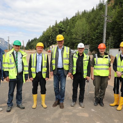 Das "ReWaste4.0"-Projektkonsortium mit u. a. Montanuni-Rektor Wilfried Eichlseder (ganz links) und Projektleiter Dr. Renato Sarc (6.v.r.) auf dem Versuchsgelände in St. Michael