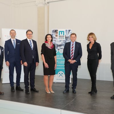 v. l. Landeshauptmann Hermann Schützenhöfer, Montanuni-Universitätsratsvorsitzende LH a. D. Waltraud Klasnic, Departmentleiter des "Zentrum am Berg" Univ.-Prof. Dr. Robert Galler, Montanuni-Vizerektorin Martha Mühlburger, Vizekanzler a. D. Uniratsvorsitzender a. D. Dr. Hannes Androsch, Bundesminister für Bildung, Wissenschaft und Forschung Heinz Faßmann, Landesrätin MMag.a Barbara Eibinger-Miedl, Landesrätin Mag.a Ursula Lackner, Montanuni-Rektor Wilfried Eichlseder