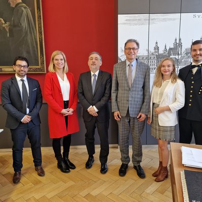 Bei der 20-Jahr-Feier von links: Rektor Wilfried Eichlseder, Univ.-Prof. Dr. Wolfgang Kern (wissenschaftlicher Geschäftsführer), Dr. Elisabeth Ladstätter (kaufmännische Geschäftsführerin, MMag.a Barbara Eibinger- Miedl (Landesrätin), Willibald Mautner (Finanzreferent)