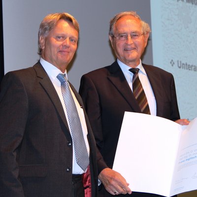 Em.O.Univ.-Prof. Dr. Franz Jeglitsch (rechts) und Laudator Univ.-Prof.i.R. Dr. Albert Kneißl nach Verleihung der EhrenwürdePresseaussendungen TU Austria