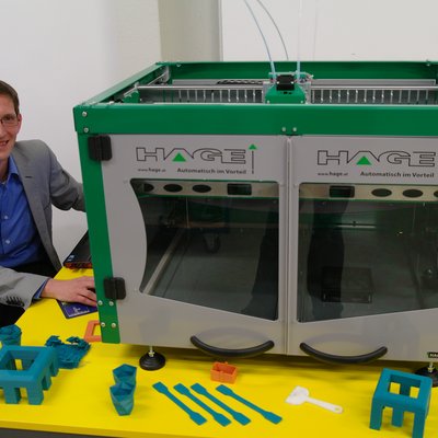 Stephan Schuschnigg mit der neuesten Errungenschaft der Kunststoffverarbeitung dem 3-D-Drucker Hage 3Dp-A2