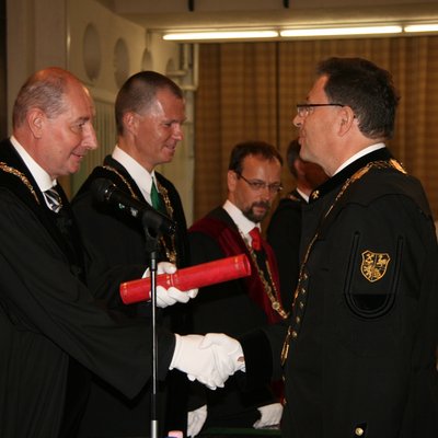 Prof. Dr. Torma András, Rektor der Universität Miskolc (links), bei der Überreichung der Urkunde an den Leobener Rektor Wilfried Eichlseder