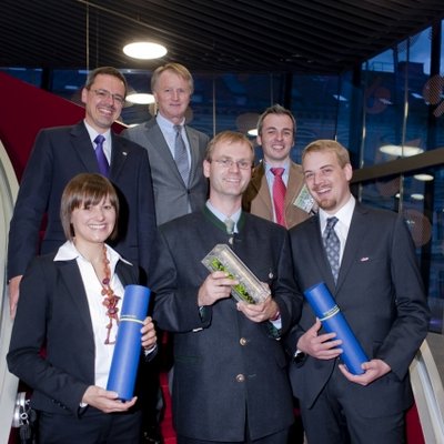 Rektor der Kunstuniversität Georg Schulz und IV-Präsident Jochen Pildner-Steinburg mit der Gewinnerin und den Gewinnern des Universitätsforschungspreises sowie des Sonderpreises für junge Forscherinnen und Forscher Anna Maria Köck, Arno Eichberger, Martin Pfeiler und Daniel Wallner (v.l.n.r.) - Foto Fischer für IV Steiermark (Abdruck honorarfrei)Presseaussendungen TU Austria