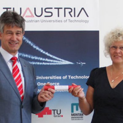 Sabine Seidler, Rektorin der TU Wien, übergibt die Präsidentschaft von TU Austria an Harald Kainz, Rektor der TU Graz