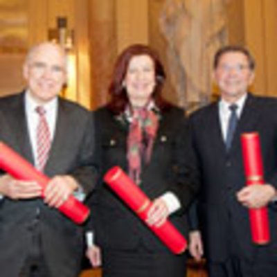 v.l.n.r.: Ehrensenator und Träger des Erzherzog-Johann-Ehrenrings Helmut List, Ehrensenatorin Monika Fehrer und Ehrensenator Maximilian Ardelt (© Foto: TU Graz/Lunghammer)