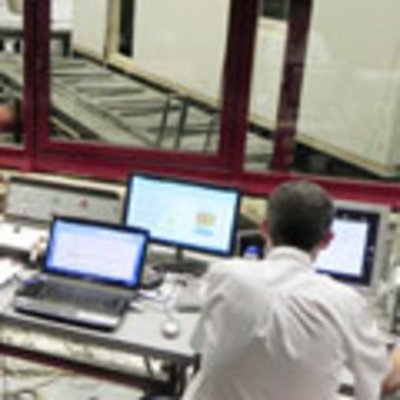 Von der "Kommandozentrale" aus haben die Forscher den Rütteltisch im Blick und können den Erdbebenversuch steuern. (© Foto: TU Graz/Lignum)
